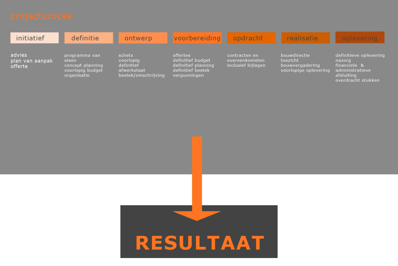 Wij werken volgens een beproefde project-procesmethode. Op deze manier worden de juiste stappen op het juiste moment gezet. U loopt niet het risico dat u later geconfronteerd wordt met onaangename verassingen, of extra kosten waarop u niet gerekend had.